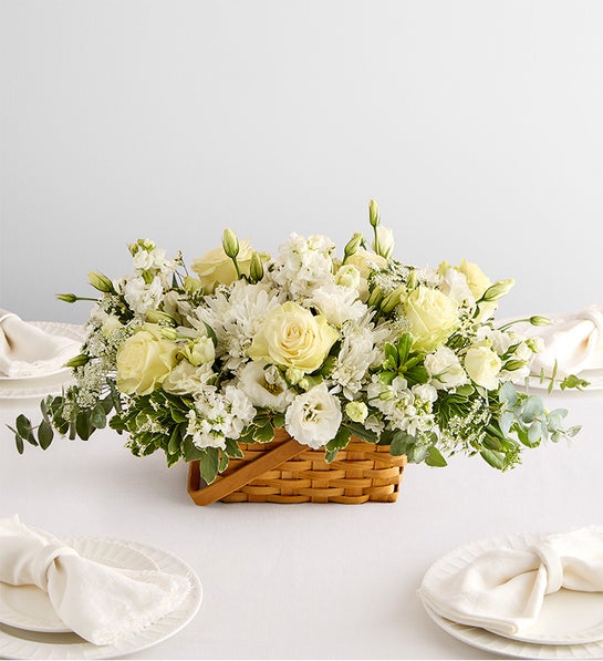 NEW This floral centerpiece is a beautiful tribute to a life well lived. White roses, lisianthuses, and other graceful blooms are arranged in a woven basket to bring comfort and serenity.