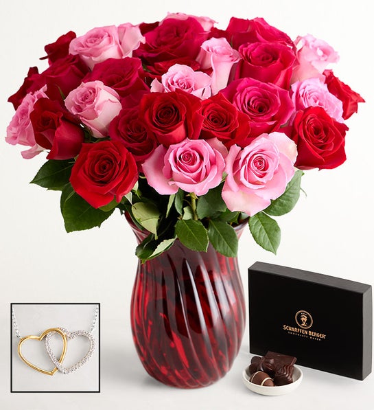 Sweep her off her feet with this lush and lavish 36-stem bouquet featuring a dozen red, a dozen pale pink, and a dozen hot-pink roses.