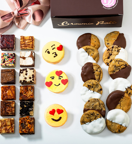 Brownie Cookie Sampler Includes The Following Individually Wrapped Items: 12 Baby Brownies 12 Half Dipped Cookies 1 BrowniEmoji Kissy Face 1 BrowniEmoji Heart Face 1 BrowniEmoji Heart Eyes