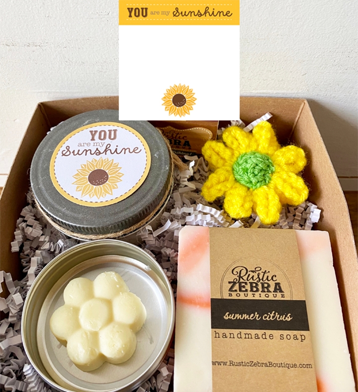 This delightful gift set includes a 4 oz natural, hand-poured soy candle in a mason jar with a lemon scent, a custom box of matches, a flower-shaped lavender lotion bar, handmade soap in summer citrus scent, and a small crochet sunflower. Completed with a custom greeting card for your personal message, it’s a cheerful way to brighten someone’s day with fresh scents and thoughtful details.